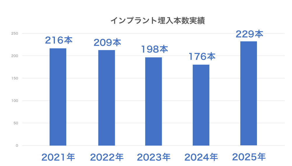 当院は2024年6月で開業32年を迎えました。地域の患者様に選ばれるインプラント治療を提供するため、日々研鑽しております。リスクを抑えて意図した通りの治療ができるよう新しい技術を導入し、今後も患者様のニーズに応えられるよう尽力したいと考えております。 2021年から2025年までの5年間だけでも1,028本のインプラント埋入数を有しております。詳細は以下の通りです。